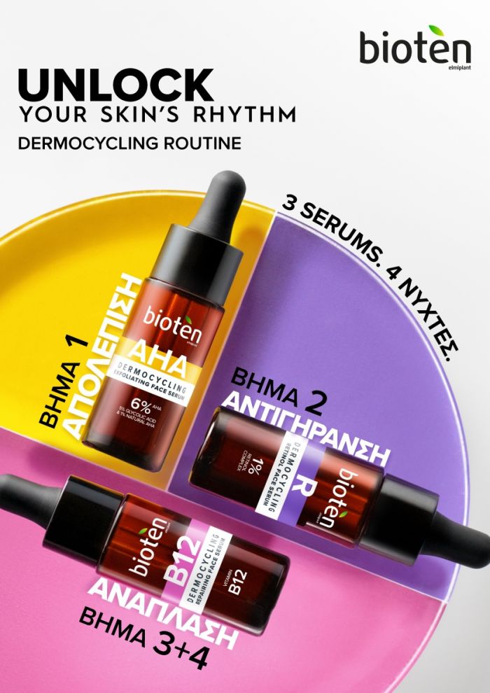 Το bioten, η Νο.1* μάρκα στους ορούς προσώπου, πρωτοπορεί με το νέο λανσάρισμα της σειράς bioten Dermocycling και εισάγει πρώτο στην αγορά ευρείας κατανάλωσης μια ολοκληρωμένη νυχτερινή ρουτίνα περιποίησης τεσσάρων σταδιών, που περιλαμβάνει απολέπιση, αντιγήρανση και βαθιά ενυδάτωση της επιδερμίδας. Η στοχευμένη αυτή προσέγγιση μεγιστοποιεί την αποτελεσματικότητα των συστατικών, προσφέροντας ορατή βελτίωση στην όψη και την υφή της επιδερμίδας, χωρίς να διαταράσσει τον επιδερμικό φραγμό.