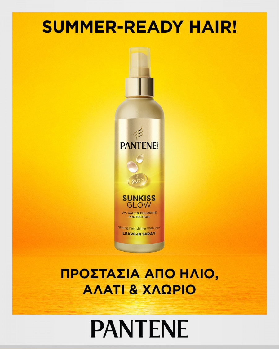 Φέτος το καλοκαίρι δεν θα αγχωθείς για τους μεγάλους «εχθρούς» των μαλλιών σου: τις ακτίνες UV (UVA/UVB), το αλάτι της θάλασσας και το χλώριο της πισίνας γιατί χάρη στο νέο Pantene Sunkiss Glow Leave-In Spray θα έχεις την απόλυτη προστασία!