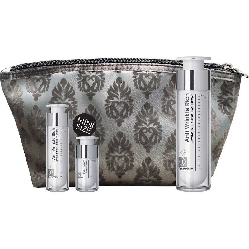 Το σετ περιέχει: Μία Frezyderm Anti-Wrinkle Rich Day Cream 50ml. Αντιρυτιδική κρέμα ημέρας με συσφικτική και ανορθωτική δράση για ώριμα δέρματα. Μία Anti-Wrinkle Rich Night Lifting & Firming Cream 15 ml. Αντιρυτιδική κρέμα εξειδικευμένη να δρα κατά τη διάρκεια της νύχτας, τότε που τα κύτταρα της επιδερμίδας ανανεώνονται. Μία Frezyderm Anti- Wrinkle Eye cream 5ml. Αντιρυτιδική κρέμα ματιών με αναπλαστική και επανορθωτική δράση.