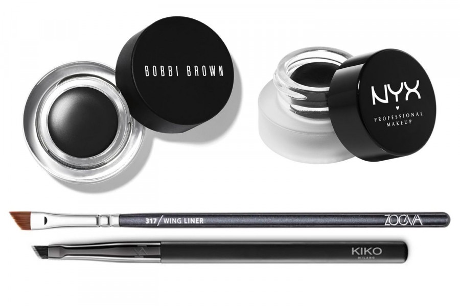 Τα αγαπημένα του eyeliners και πινέλα είναι τα: Bobbi Brown, Long-Wear Eyeliner (πάνω αριστερά) και NYX Professional Makeup, Epic Black Mousse Liner. Τα πινέλα που αγαπά περισσότερο είναι τα: ZOEVA, Νο 317 Wing Liner (πάνω) και KIKO Milano, Eyes 62 Slanted Eyeliner Brush (κάτω).