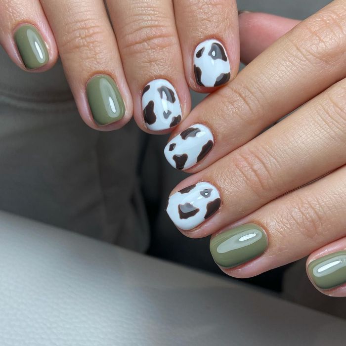 Όπως πολύ καλά φαντάστηκες, τα cow print nails είναι μανικιούρ με τις μαύρες ακανόνιστες βούλες που έχει στο σώμα της η αγελάδα. Πρόκειται για ένα δυναμικό, wild και έντονο nail art σε πρώτη ανάγνωση, που με τη σωστή τεχνική – από τη μανικιουρίστ σου ή εσένα την ίδια- μπορεί να γίνει super chic και πολύ διακριτικό, αν αυτό θέλεις.