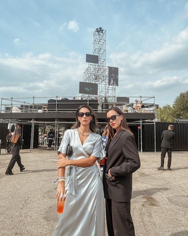 Ας ξεκινήσουμε με την Ευγενία, που επέλεξε ένα πιο βραδινό look, με ένα maxi φόρεμα με κοντά μανίκια, που έδενε στο πλάι, σε ένα απίστευτο μεταλλικό ασημί χρώμα. Από κάτω φόρεσε μαύρα πέδιλα με ψηλό τακούνι και χτένισε τα μαλλιά της σε κύματα. Από την άλλη είχαμε τη Σάντυ, που πραγματικά απογείωσε το total black, με ένα oversized κοστούμι, με loose ώμους και φαρδύ παντελόνι. Δεν φόρεσε κάποιο top από μέσα και ολοκλήρωσε την εμφάνισή της με ένα ζευγάρι neon, κίτρινα πέδιλα και μία mini bag σε έντονο πράσινο. Έκανα τα μαλλιά της ίδια, με χωρίστρα στο πλάι και φόρεσε πολλά, λεπτά κολιέ σε layering και ένα ζευγάρι ορθογώνια γυαλιά ηλίου.