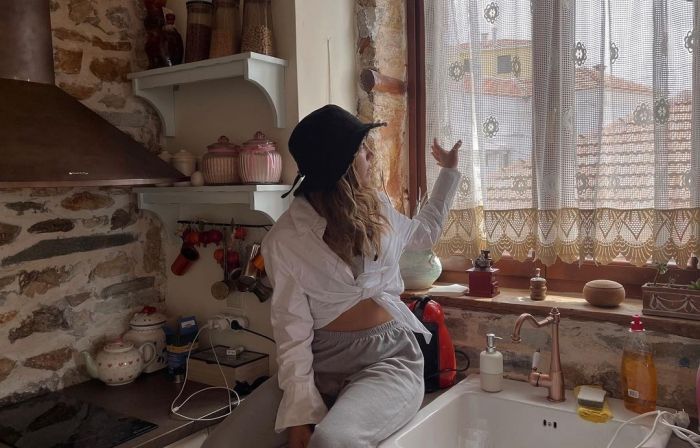 Το τζιν δεν χρειάζεται να είναι μόνο μπλε. Η Σάντυ φόρεσε ένα item στο πιο ιδιαίτερο denim ύφασμα.