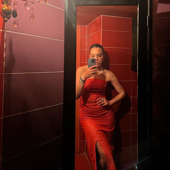 Μιλάμε για ένα φοβερό strapless, midi φόρεμα σε ίσια γραμμή, με κάποιες χαρακτηριστικά εξώραφα στο στήθος και το τελείωμα. Το συγκεκριμένο φόρεμα έχει και ένα μικρό σκίσιμο στο πόδι, που του δίνει μία πιο γεωμετρική εικόνα. Αλλά το πιο σημαντικό στο συγκεκριμένο ρούχο είναι το χρώμα του. Το ιδιαίτερο πορτοκαλί/κεραμιδί denim ύφασμα, που το κάνει τόσο ξεχωριστό.