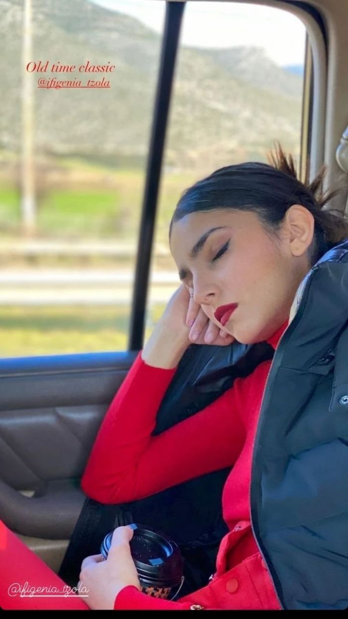 Αυτό, όμως, που δεν παρέλειψε η Ιφιγένεια είναι να προσέξει το make up και το χτένισμά της, κάνοντας ένα χαμηλό 00s πιάσιμο με χωρίστρα στο πλάι στα μακριά μαλλιά της και βάζοντας ένα επίσης κόκκινο κραγιόν και κάποια στρασάκια δίπλα στα μάτια. Δεν φόρεσε κάποιο σκουφάκι ή καπέλο και ήταν πραγματικά η πιο εντυπωσιακή παρουσία του χιονοδρομικού.