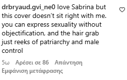 «Λατρεύω τη Sabrina, αλλά αυτό το εξώφυλλο δεν μου αρέσει καθόλου. μπορείς να εκφράσεις τη σεξουαλικότητα χωρίς αντικειμενοποίηση, και το πιάσιμο των μαλλιών μυρίζει πατριαρχία και ανδρικό έλεγχο», έγραψε κάποιος άλλος χρήστης.