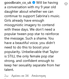 «Θα συζητήσω με την 9χρονη κόρη μου για το αν μπορούμε να συνεχίσουμε να υποστηρίζουμε τη μουσική της Sabrina. Τα κορίτσια έχουν ήδη αρκετές μισογυνιστικές εικόνες να αντιμετωπίσουν αυτές τις μέρες. Δεν χρειαζόμαστε μια δημοφιλή ποπ σταρ για να ενισχύσουμε το μήνυμα. Τι κρίμα. Έχεις μια όμορφη φωνή, δεν χρειαζόταν να το κάνεις αυτό για να ενισχύσεις τη δημοτικότητά σου. Είναι απίστευτο ότι η Taylor είναι ΑΚΟΜΑ η μόνη γυναίκα ποπ σταρ που είναι αρκετά δυνατή και με αυτοπεποίθηση ώστε να κρατήσει τη σεξουαλικότητά της χωριστά από το ταλέντο της», έγραψε μία γυναίκα στην τελευταία ανάρτηση της Sabrina Carpenter.