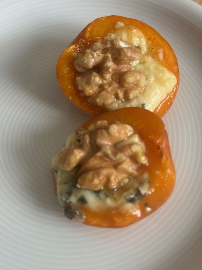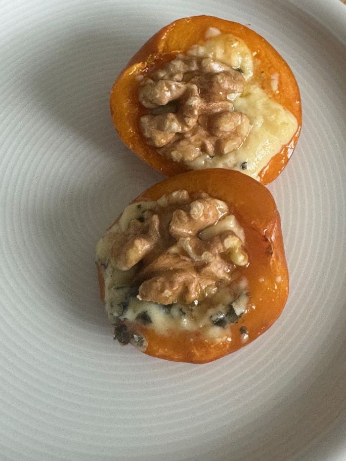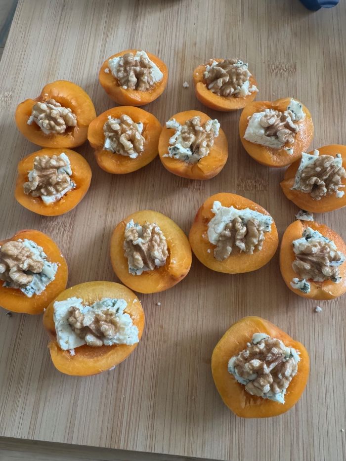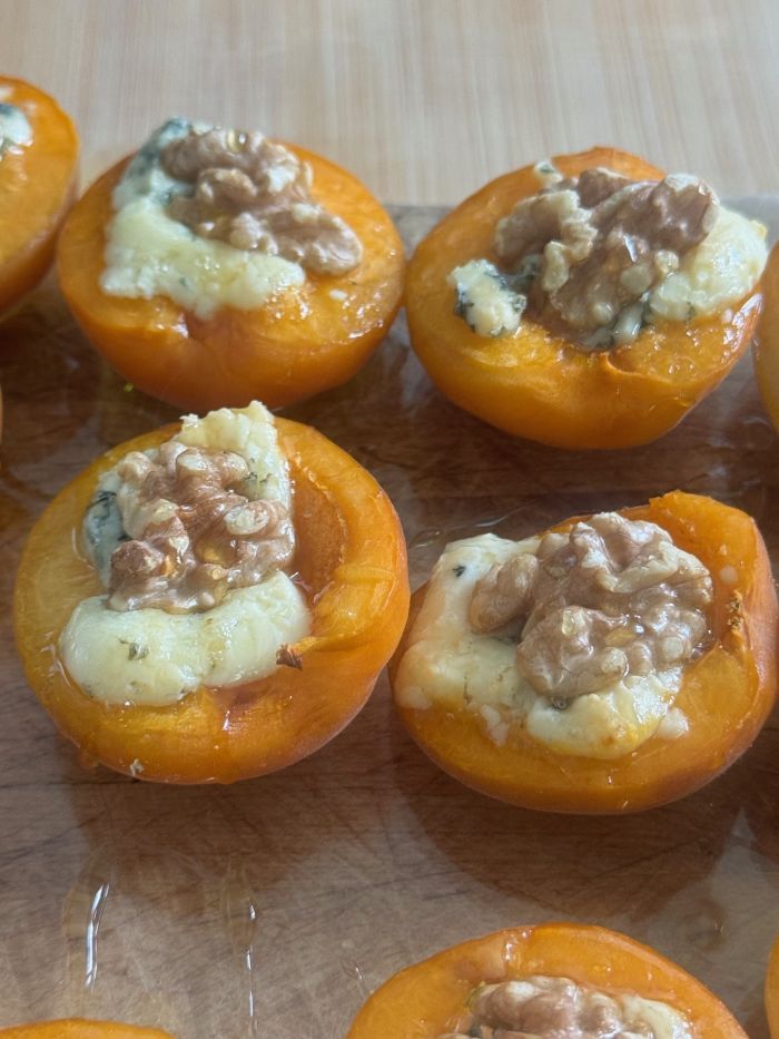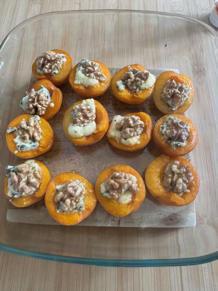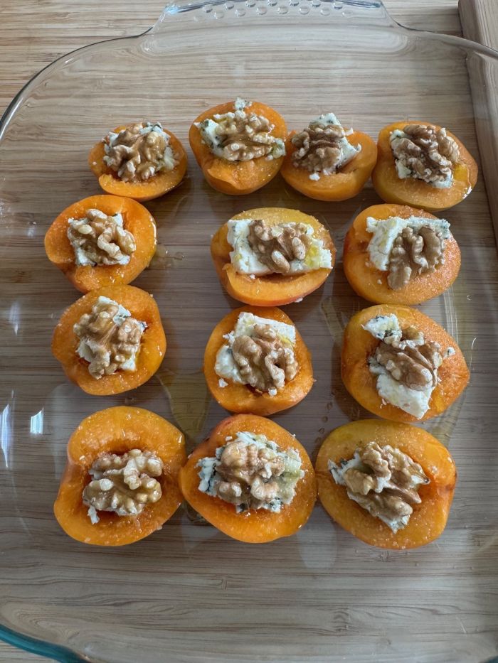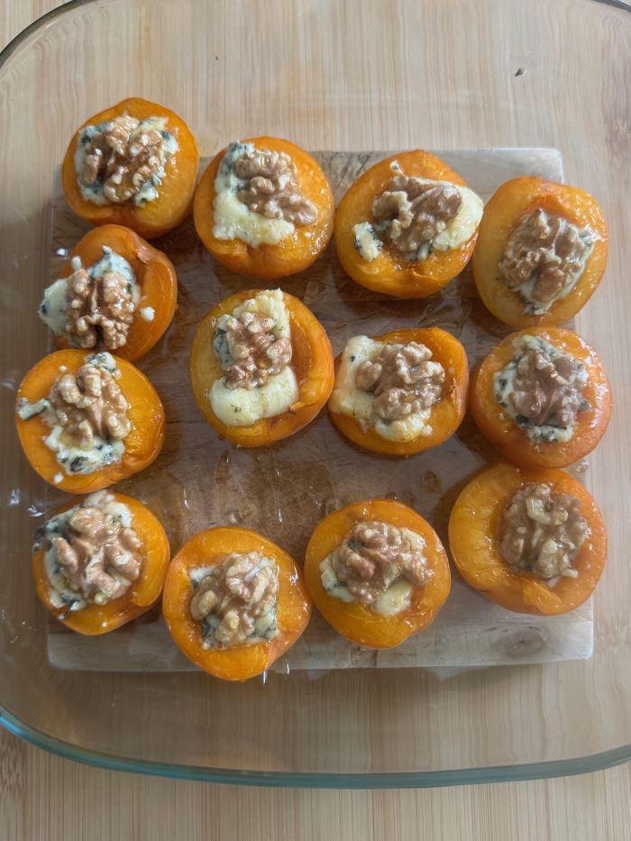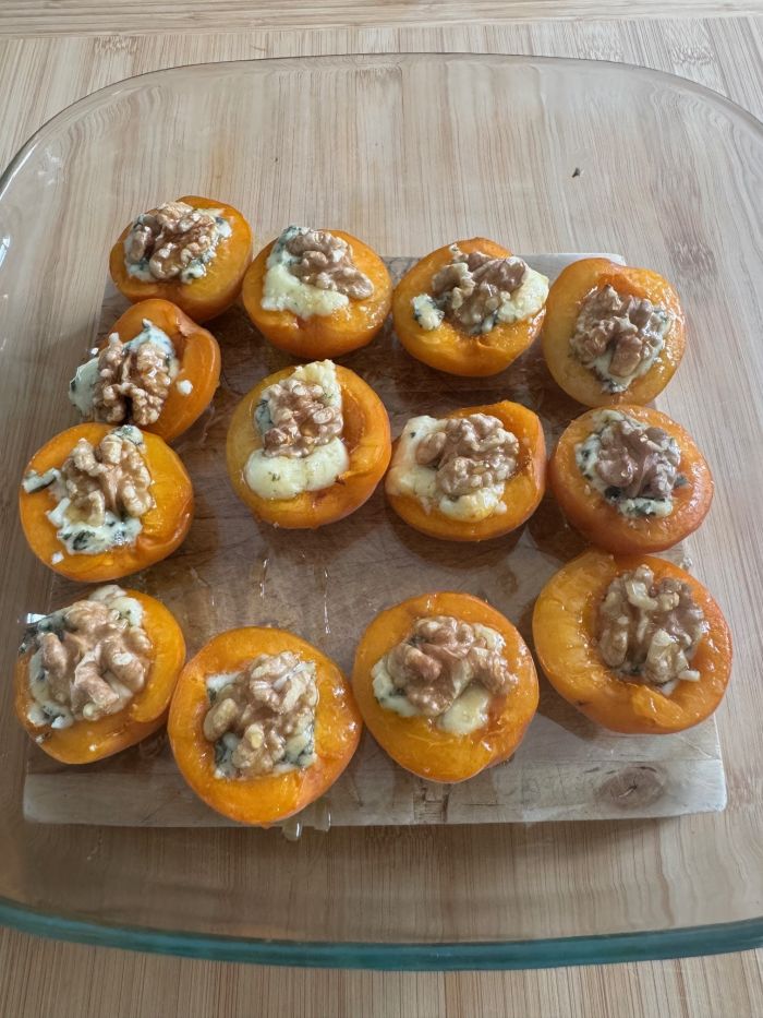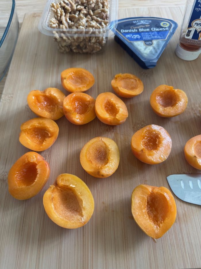 - Κόβουμε ή θρυμματίζουμε το μπλε τυρί και το τοποθετούμε στο κέντρο κάθε βερίκοκου.