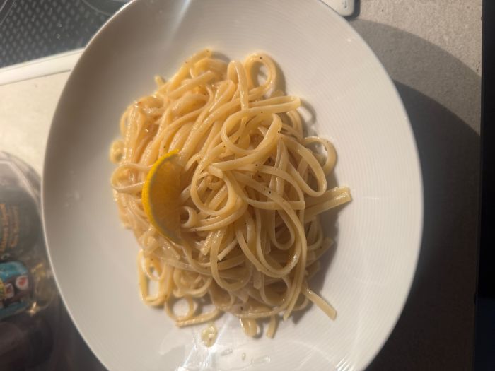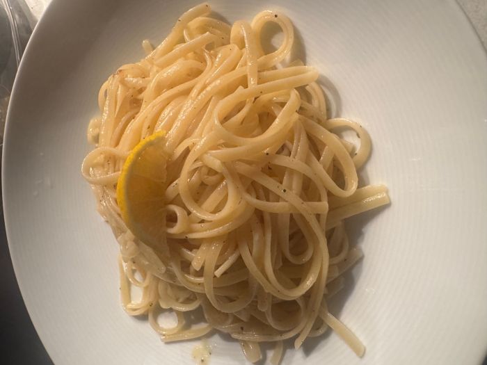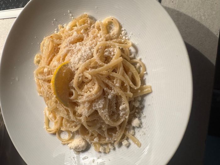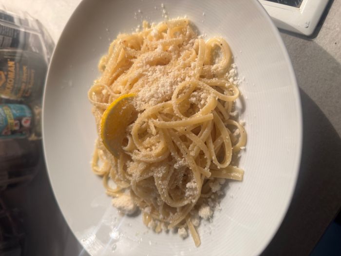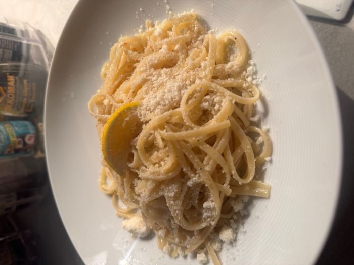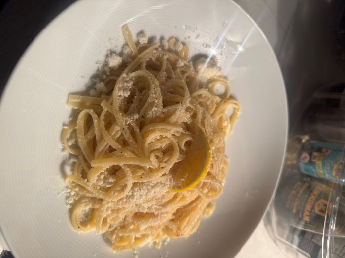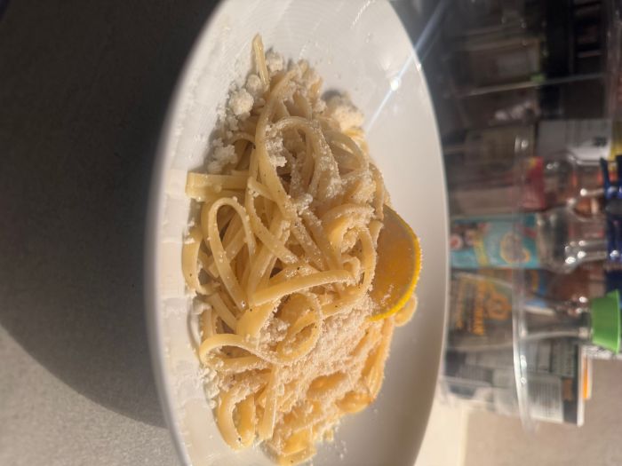 Κυριακή και δεν είχα τίποτα στο ψυγείο παρά μόνο ένα λεμόνι, παρμεζάνα και βούτυρο. Και έτσι έφτιαξα τα πιο νόστιμα εύκολα και απλά Λιγκούινι με βούτυρο, λεμόνι, πιπέρι και παρμεζάνα.