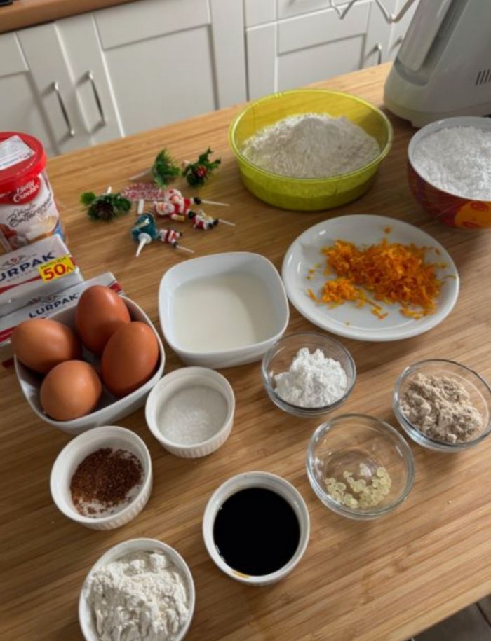 - Προσθέτουμε στο μίξερ τα αλεσμένα αρώματα, το ξύσμα πορτοκαλιού και τη βανίλια.