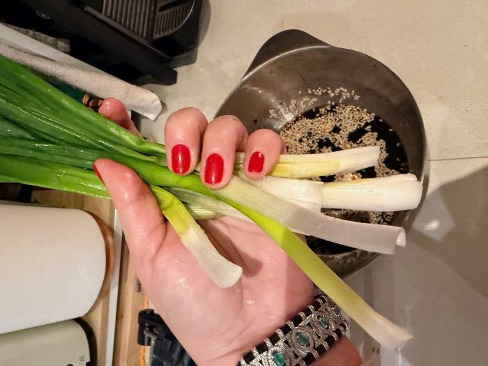 - 1–2 φρέσκα κρεμμυδάκια, ψιλοκομμένα ( τα έβαλα ολόκληρα )