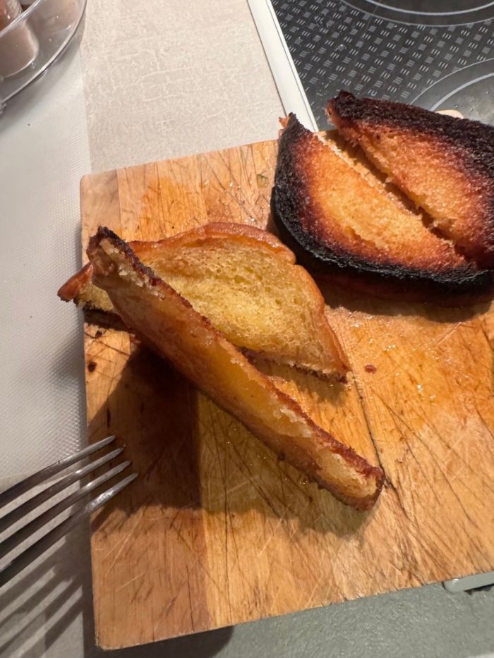 • Σε ένα τηγάνι σε χαμηλή φωτιά τηγανίζουμε το ψωμί και από τις 2 πλευρές.