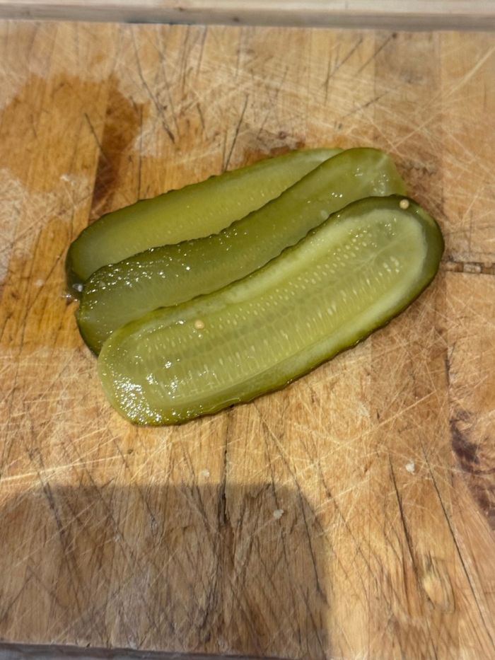 • 2–3 μικρά πίκλες αγγουράκι, πολύ ψιλοκομμένα