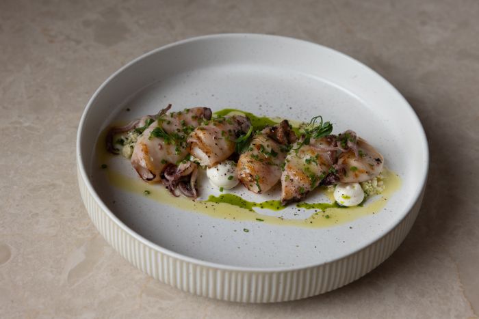Πολύ δημοφιλές επίσης και εξαιρετικά νόστιμο το καλαμάρι σχάρας με μία κρέμα από τον παραπάνω θεϊκό ταραμά, ένα κους κους από κουνουπίδι και πίκλες μουστάρδας.