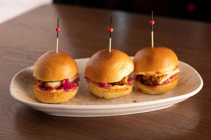 Σε καθαρά bar food tempo κινούνται τόσο τα πολύ νόστιμα Tacos με κοτόπουλο, που κρύβουν μέσα πλούσια tonkatsu σως, pico de gallo, γιαούρτι και τριμμένο τυρί, όσο και τα Chicken mini burgers με λαχταριστό τηγανητό κοτόπουλο, sriracha mayo, πίκλα αγγούρι και λάχανο.
