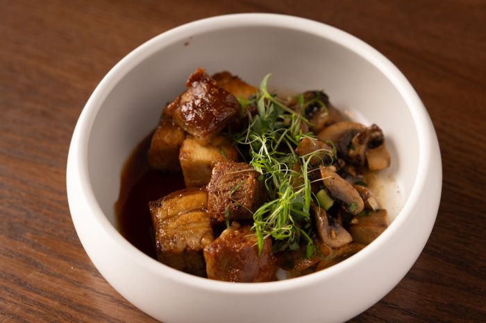 Ένα πιο «εστιατορικό» πιάτο και πολύ επιτυχημένο είναι η Πανσέτα με σάλτσα σόγιας, ιαπωνικό dressing, τομάτα, κρεμμύδι και μανιτάρια.