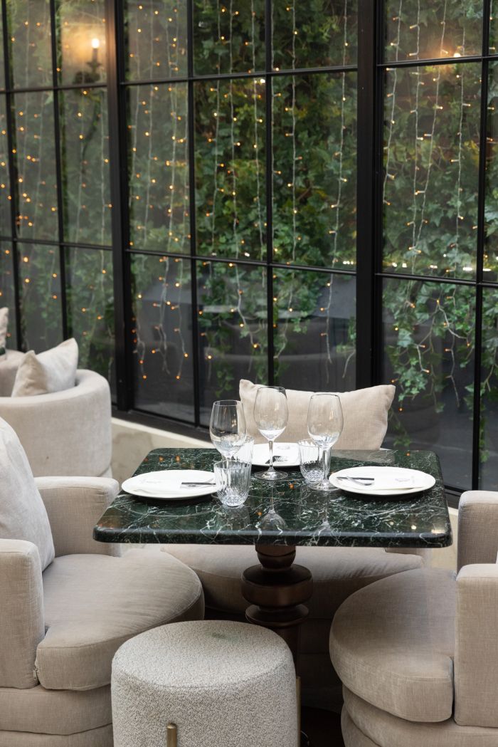 Ο πανέμορφος χώρος του παραμένει άκρως ατμοσφαιρικός με την υποβλητική εσωτερική σάλα με τα κομψά στρωμένα τραπέζια, τα τέλεια σιδερωμένα τραπεζομάντηλα, τα κεριά, τις γύψινες λεπτομέρειες και τους πολυελαίους να δίνει τη σκυτάλη στις δύο αέρινες εξωτερικές «αυλές».