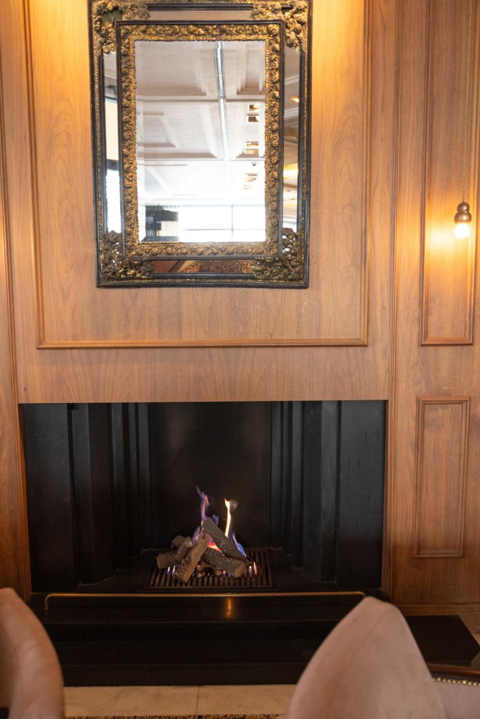 Σωστά στρωμένα τραπέζια με λευκά τραπεζομάντηλα, custom-made πιάτα από την Themis Z, βαριές κουρτίνες, σκούρο ξύλο, ζεστές γωνιές που χαρίζουν μεγαλύτερη ιδιωτικότητα, άνετες πολυθρόνες μπροστά στο τζάκι για lounging με ποιοτικό καφέ.