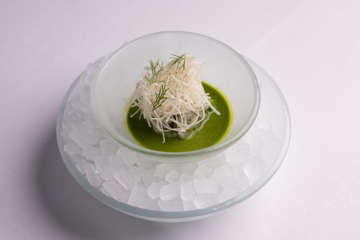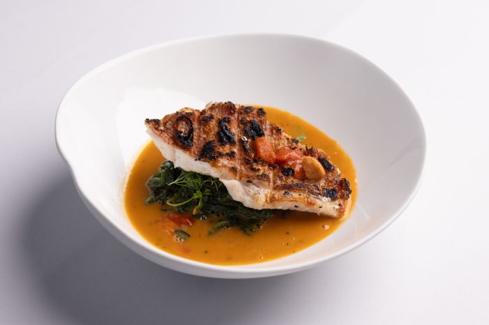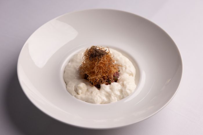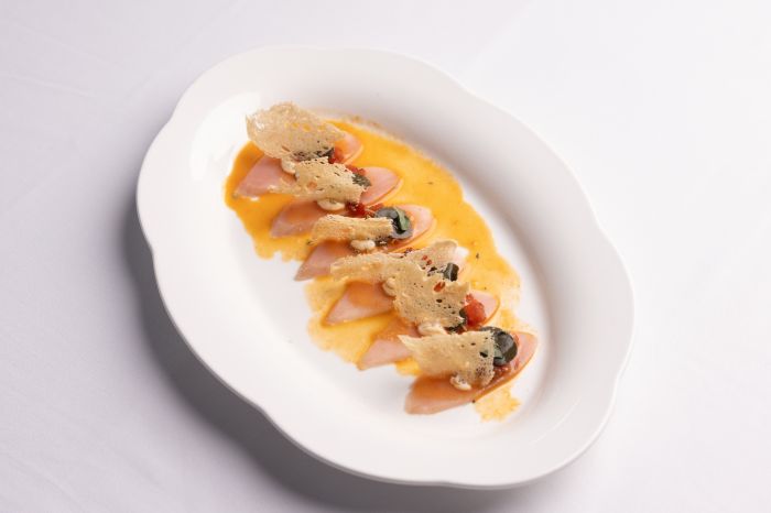 Το Καρπάτσιο παλαμίδας με υφές τομάτας, αγουρίδα και ταραμά, μία δική τους εκδοχή ενός ελληνικού σασίμι, κέρδιζε στα σημεία, με τον ταραμά να προσθέτει γευστικό βάθος σε μία πολύ ραφιναρισμένη πρόταση.