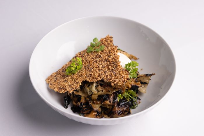 Το Λάχανο καπνιστό με κράκερ σπόρων και τυρί Σαν Μιχάλη σε ρόλο ζεστής σαλάτας είναι ιδιαίτερα νόστιμο, με το στοιχείο του καπνιστού και της φωτιάς να κυριαρχεί και να συναρπάζει.