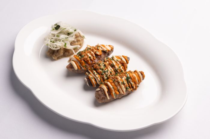 Ένα πιάτο signature του Atelier Papaioannou ήδη από την εποχή που άνοιξε στο κέντρο της Αθήνας είναι το Κεμπάπ ψαριού ημέρας, που τη συγκεκριμένη ημέρα ήταν τόνος, με πιπεριά Φλωρίνης και κρέμα ελληνικού καφέ. Πρόκειται για μία πολύ ενδιαφέρουσα πρόταση που παντρεύει τα μπαχάρια και τα καρυκεύματα του κεμπάπ με τη θαλασσινή διάσταση, χαρίζοντας ένα πολυεπίπεδο γευστικό αποτέλεσμα.