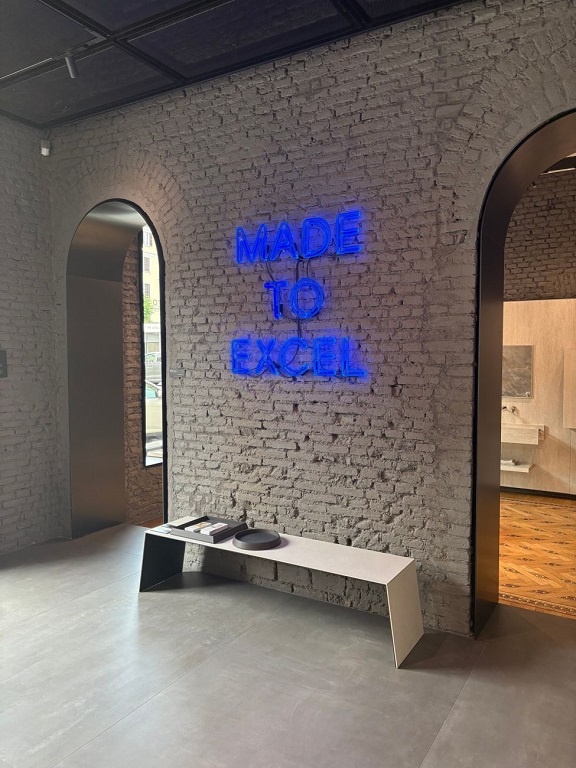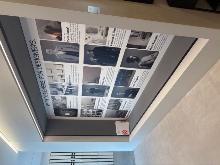 Η ξενάγηση στο κεντρικό showroom της Atlas Concorde στο Fiorano, πραγματοποιήθηκε υπό την καθοδήγηση της εσωτερικής ομάδας product design. Στην αρχή, στην τοποθεσία συναντήσαμε τον Matteo Brionni, υπεύθυνο του showroom και αρχιτέκτονα της Atlas Concorde, ο οποίος σε μια εμπνευσμένη ομιλία για τη σχέση υλικότητας και αισθητικής ταυτότητας απέδειξε ότι ο λόγος του δεν είναι θεωρητικός αλλά βιωματικός. Λόγος «σχεδιασμένος» να μας αποσυντονίσει από τις εύκολες απαντήσεις και να μας βυθίσει στη σιωπηλή σοφία της ύλης.