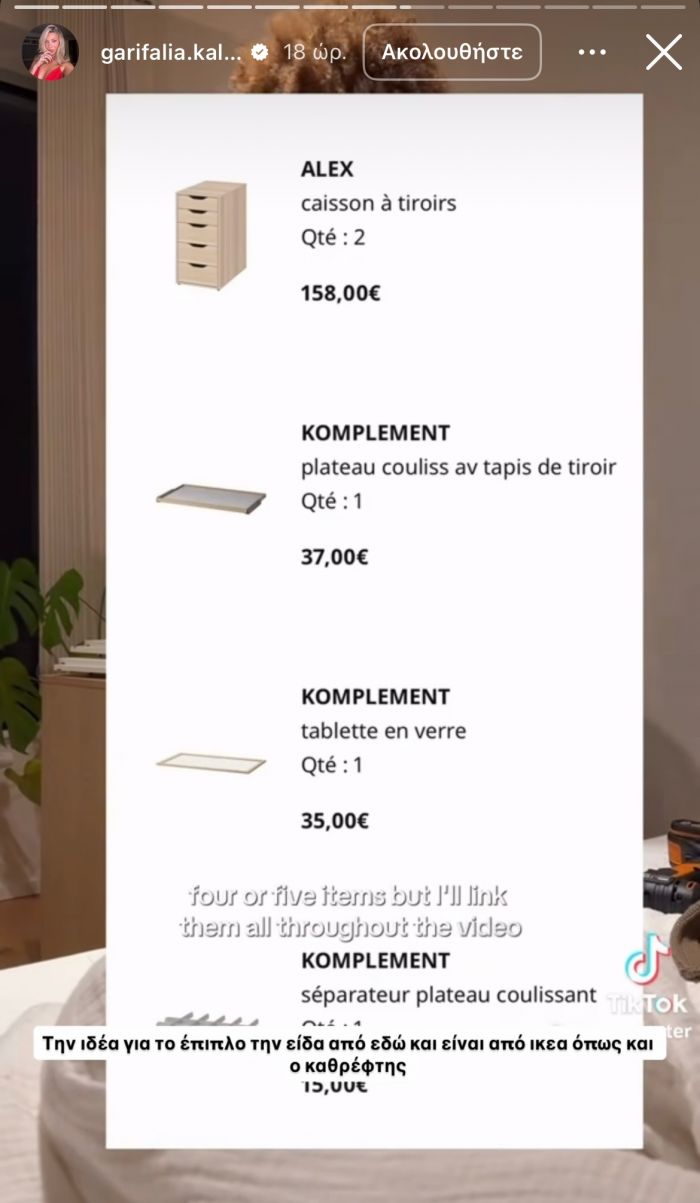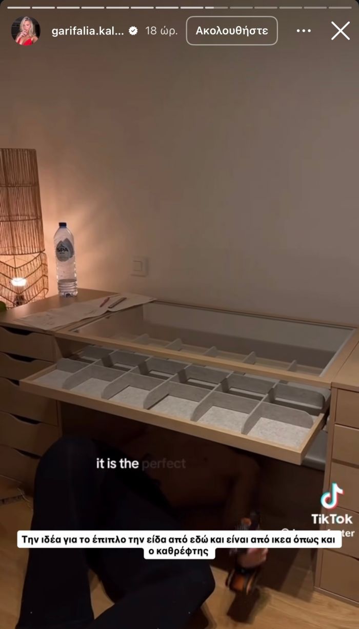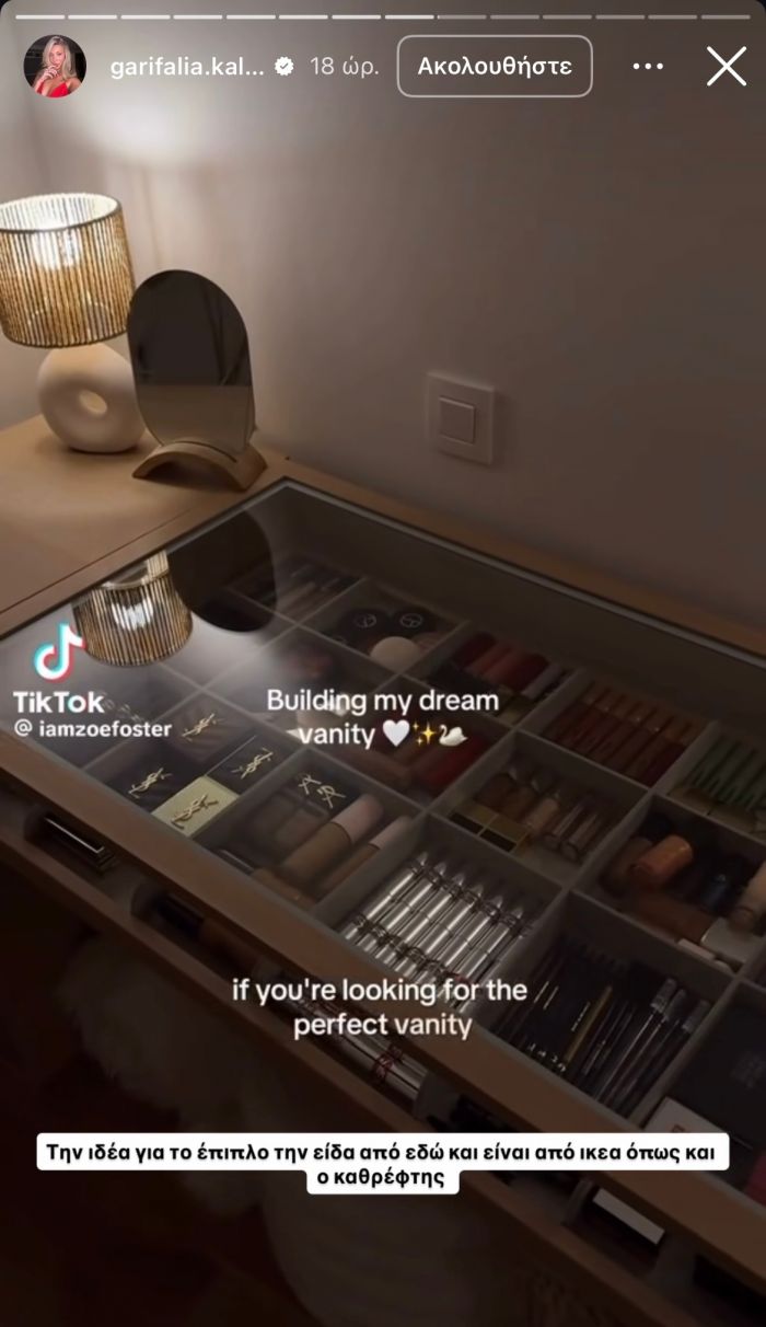 Πέρα από την εντυπωσιακή ντουλάπα με τον κρυφό φωτισμό, κάτι άλλο που σίγουρα λάτρεψαν οι followers της Γαρυφαλλιάς ήταν σίγουρα το ειδικό έπιπλο που κατασκεύασε με προϊόντα από το ΙΚΕΑ για να έχει μέσα οργανωμένα, όλα τα beauty προϊόντα της.