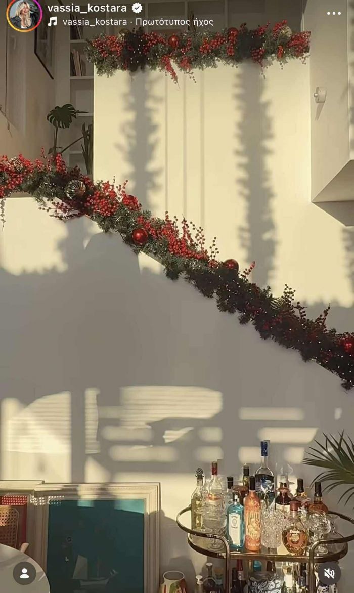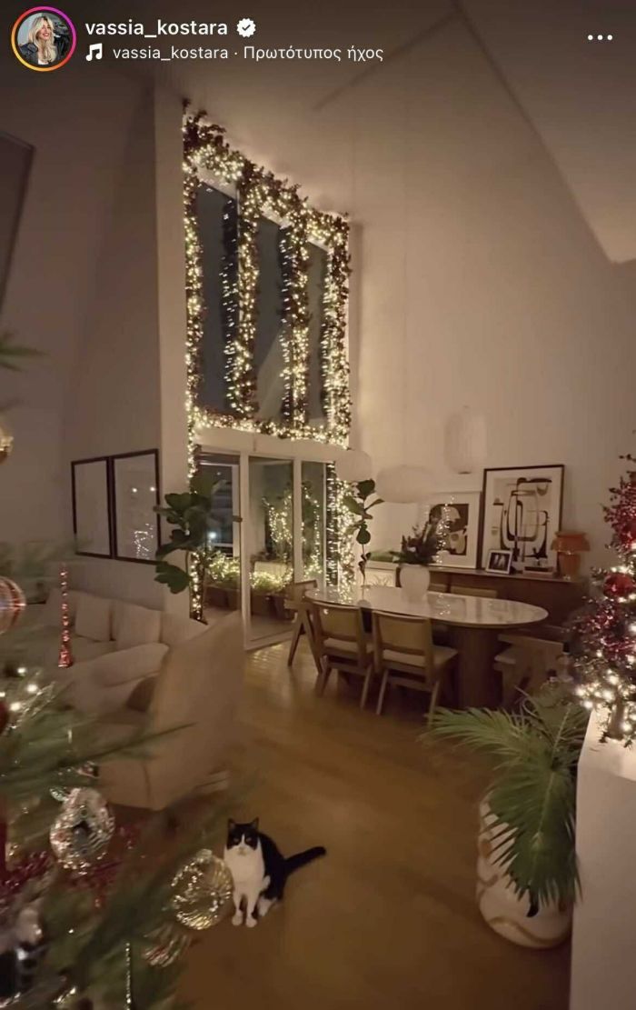 Αυτό που απογειώνει τη διακόσμηση στο σπίτι της γνωστής σχεδιάστριας βέβαια, είναι οι προσωπικές πινελιές. Oversized βάζα με φυτά εσωτερικού χώρου δίνουν ζωή στους χώρους, ενώ οι αφηρημένοι πίνακες και τα κάδρα με γεωμετρικά σχήματα προσδίδουν έναν μοντέρνο αέρα. Η Βάσια Κωσταρά, όμως, ξέρει να εντάσσει και το χριστουγεννιάτικο πνεύμα, όπως είδαμε με μοναδικό στυλ. Αντί για υπερβολές, επιλέγει elegant γιρλάντες με κόκκινους καρπούς και φωτάκια που «αγκαλιάζουν» τα ψηλά παράθυρα, ενώ τολμά να στολίσει και το τζάκι! Το bar cart με τα ιδιαίτερα ποτά δίνει μια playful διάθεση, ακόμα και μέσα στη χριστουγεννιάτικη λάμψη. Και φυσικά, το αγαπημένο της κατοικίδιο, ο γλυκός ασπρόμαυρος γάτος της, προσθέτει την πιο ζεστή και αυθεντική πινελιά.