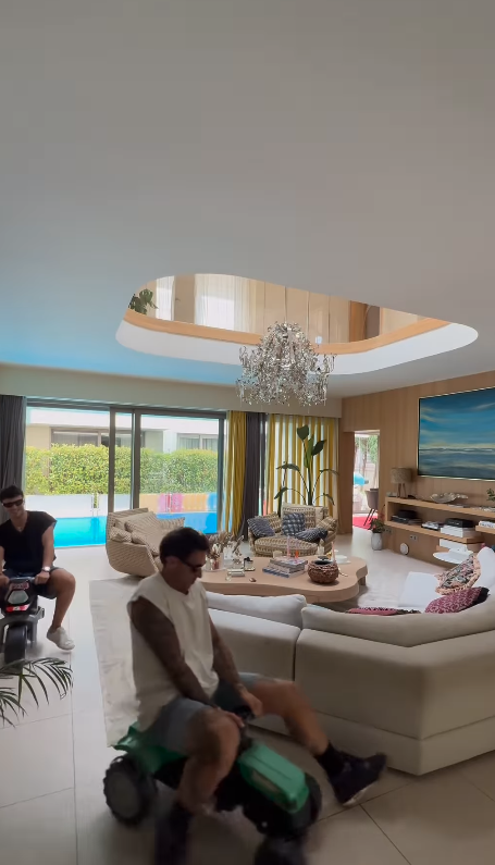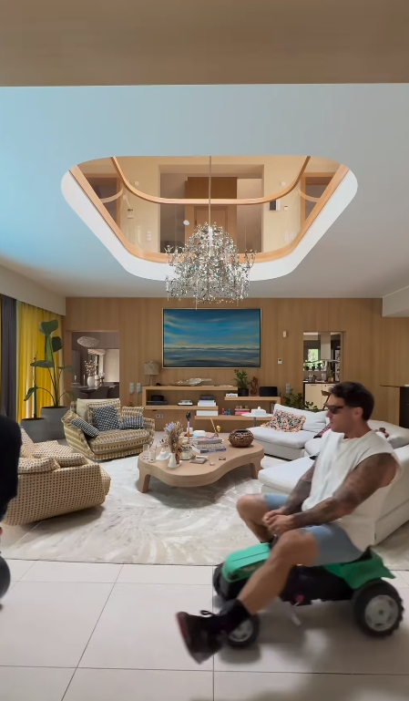 Το σπίτι της Αθηνάς είναι το απόλυτο μάθημα στο contemporary luxe decor. Το στοιχείο που κλέβει τις εντυπώσεις είναι το σαλόνι του, ένας χώρος τόσο επιβλητικός και open-plan που θυμίζει πολυτελές loft της Νέας Υόρκης. Οι τεράστιες τζαμαρίες επιτρέπουν στο φως να διαχέεται παντού, ενώ οι διαστάσεις του είναι τέτοιες που – όπως είχαμε δει στο παρελθόν με χιουμοριστική διάθεση – χωρούν ακόμα και τις μηχανές των φίλων του Bruno Cerella, δίνοντας έναν ανατρεπτικό και «ζωντανό» χαρακτήρα στην καθημερινότητα του ζευγαριού.