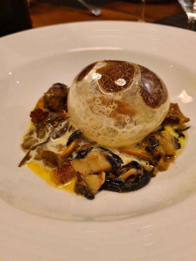Αλλά και η εντυπωσιακή Σφαίρα zabagione που μέσα έκρυβε καπνιστό αυγό, άγρια μανιτάρια και φυσικά λευκή τρούφα. Αυτό το πιάτο, το οποίο μας είπαν πως κανονικά δεν ήταν να είναι στο μενού, αλλά προέκυψε από έναν πειραματισμό που πολύ πέτυχε και είπαν να το κρατήσουν, ήταν ένα από τα πιο νόστιμα πράγματα που έχω δοκιμάσει ποτέ. Μεστό και γεμάτο, χωρίς να είναι άνευ λόγου πληθωρικό, σε έκανε να θέλεις να φας και το πιάτο.