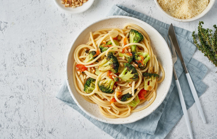 Πεντανόστιμα σπαγγέτι καρότου με κρεμώδη σάλτσα κάσιους και μπρόκολο
