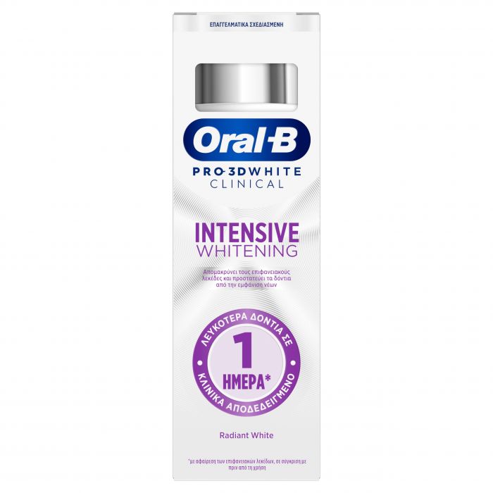 Η Oral-B Pro-3D White Clinical Intensive Whitening είναι ιδανική για ευαίσθητα δόντια, σχεδιασμένη για ασφαλή καθημερινή χρήση, ενώ συμβάλλει στην ενίσχυση του σμάλτου και την προστασία από την τερηδόνα. Είναι η ιδανική συνάντηση επιστήμης και ομορφιάς: μια καινοτομία που προσφέρει όχι μόνο το λευκότερο χαμόγελο, αλλά και τη σιγουριά ότι φροντίζετε ουσιαστικά την υγεία του στόματός σας.